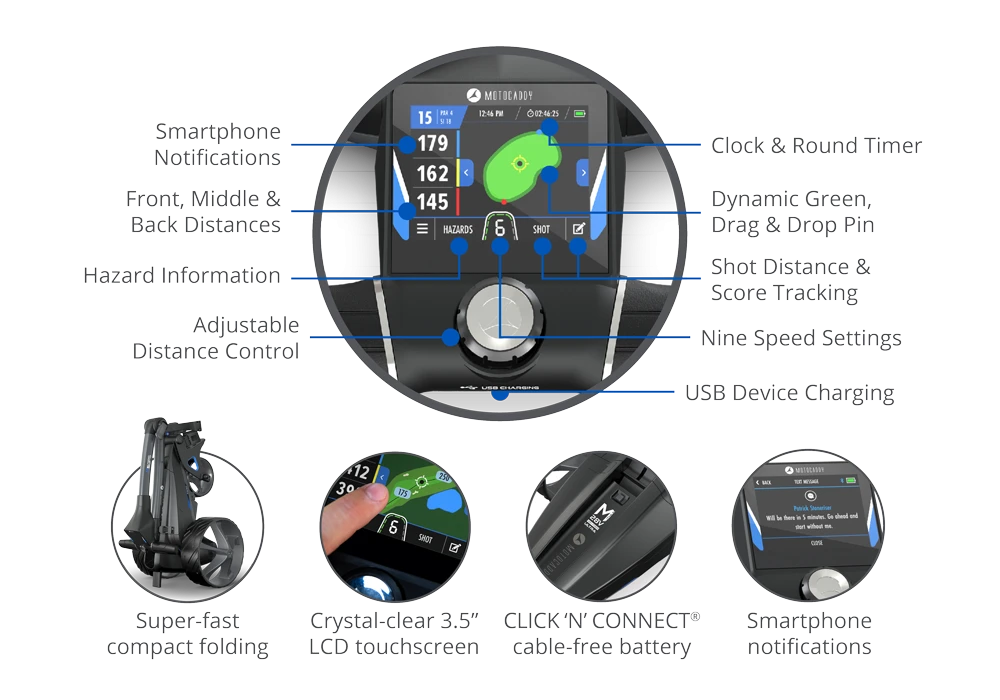 The Motocaddy M5 GPS Electric Golf Trolley redefines navigation on the course with its crystal-clear 3.5″ touchscreen display and integrated GPS functionality. Stay connected, receive smartphone alerts, and enjoy fast WIFI updates for seamless performance.